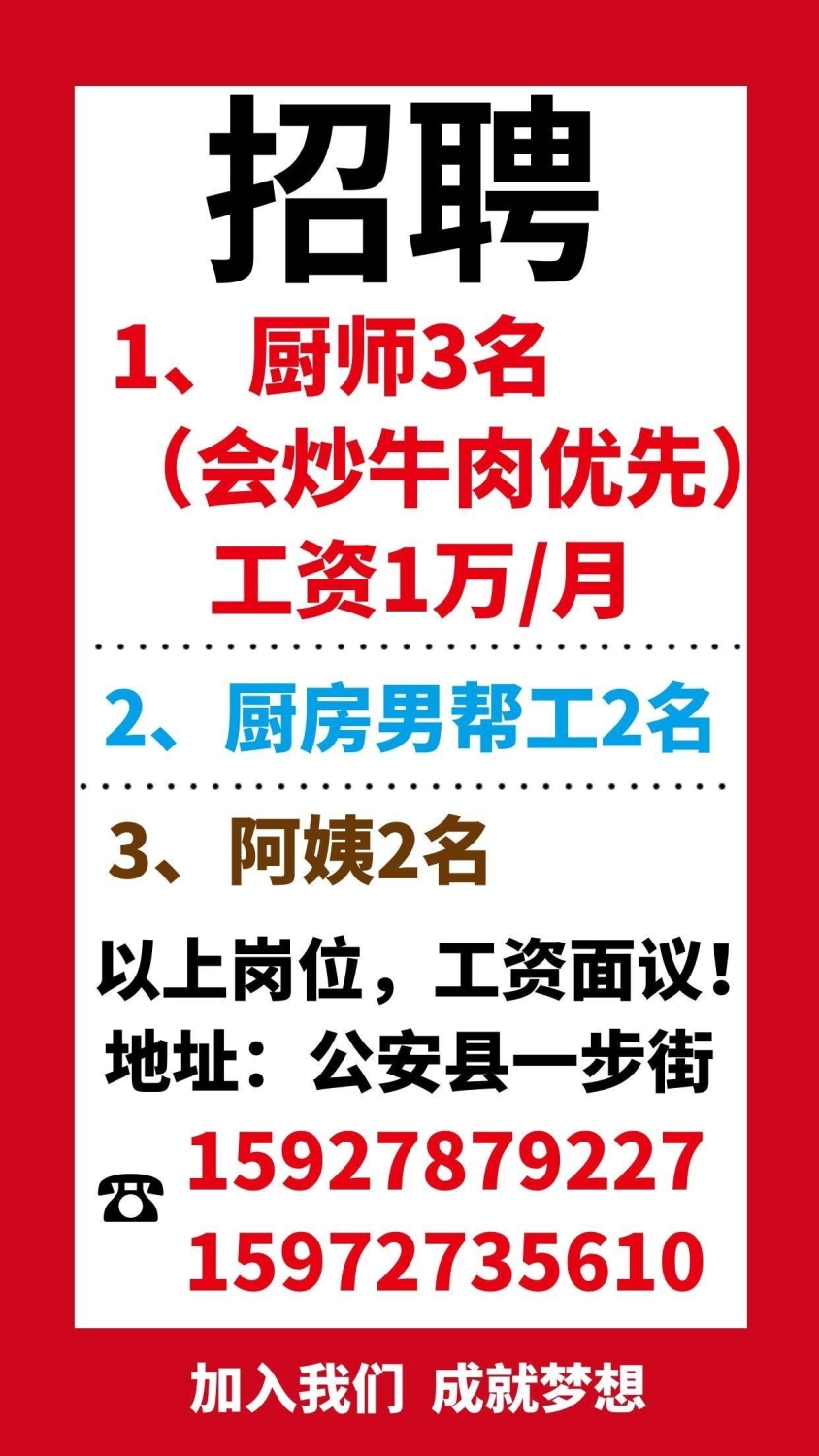 【招聘】1️⃣厨师 3 名(会炒牛肉优先),工资 1 万/月 。2️⃣厨房男帮工...