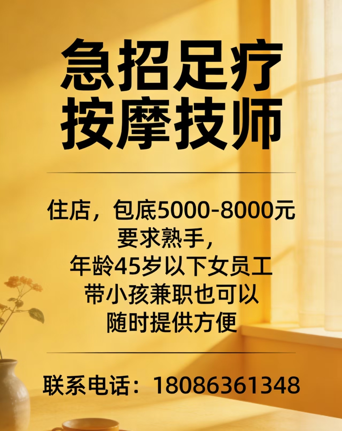 【急招】足疗按摩技师,住店,包底5000-8000元,要求熟手,年龄45岁以下女...