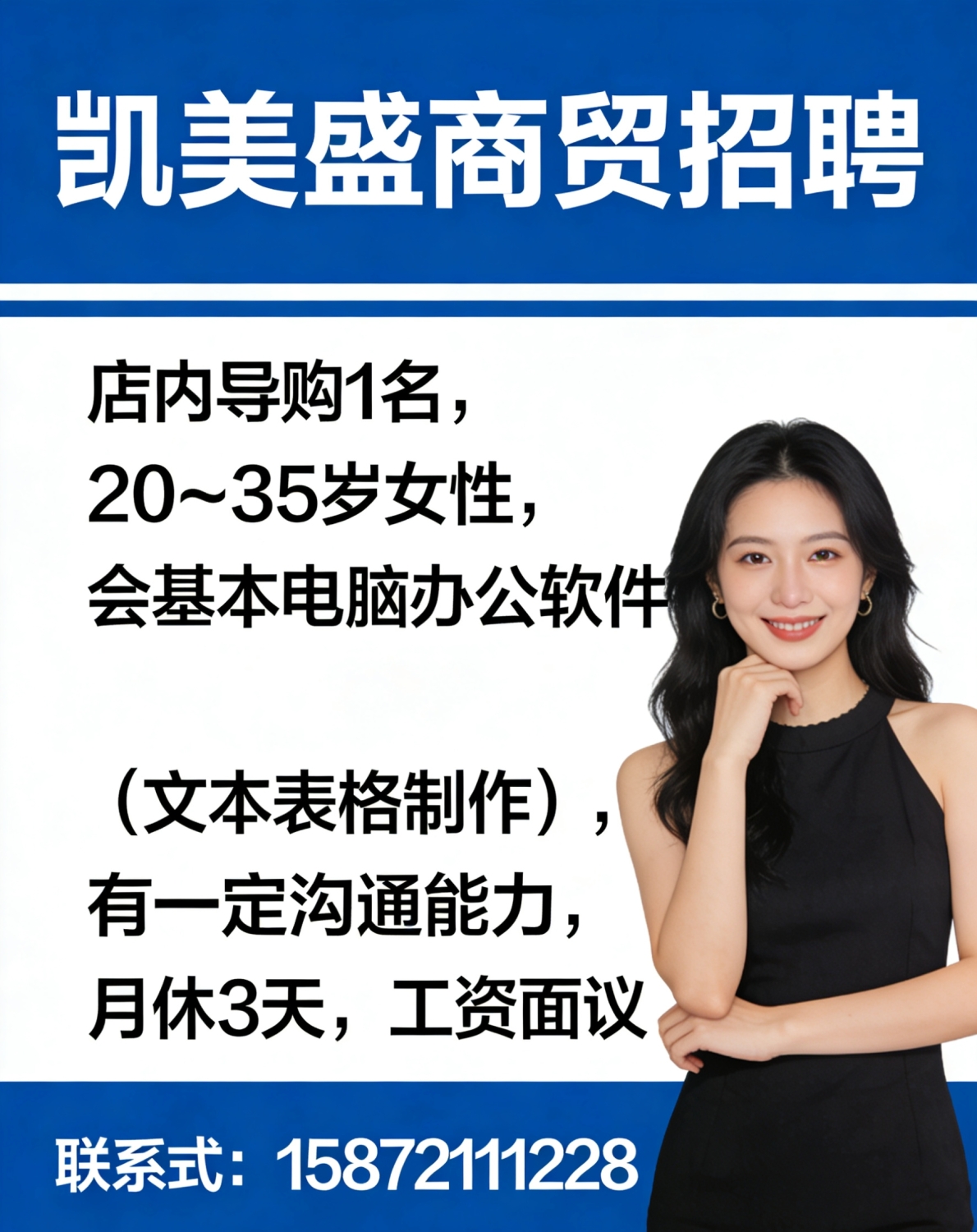 凯美盛商贸招聘店内导购 1 名,20~35 岁女性,会基本电脑办公软件(文本表...