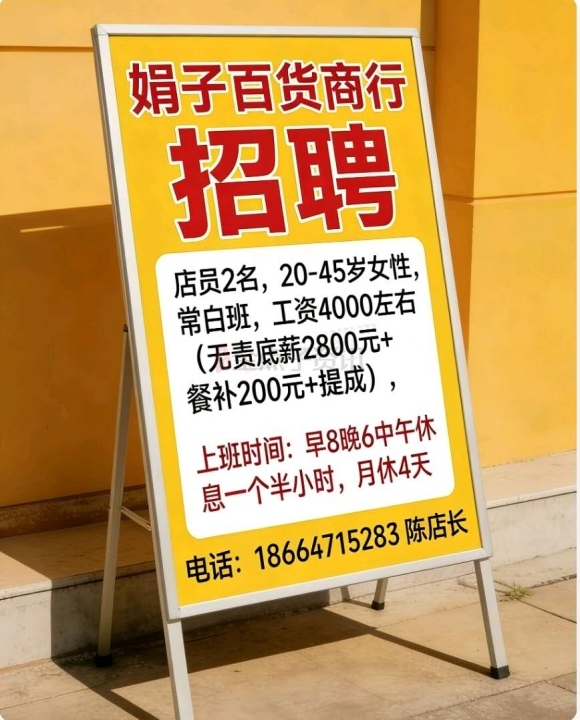 【娟子百货商行招聘】店员两名,20-45岁,女性,常白班,工资4000左右(无...