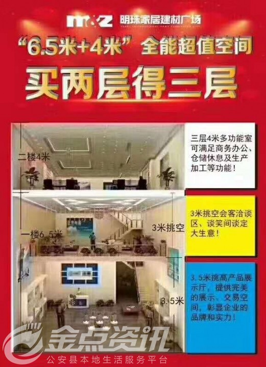公安县唯一的一站式家具建材广场,低入手高回报,有带租约或毛坯的成熟商铺,一楼6.5米,二楼4米,2 层变3层的独栋门铺,独立产权 ,总价65万,首付仅33万 ,自由搭配,完美设计,宜商宜居,高格调,空间多功能利用,先到先得,你值得拥有[勾引]最后30套 抢购热线:明珠广场 周女士 *****8182 期待您的来电[太阳]