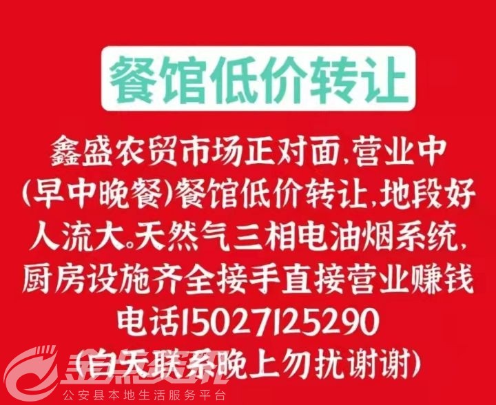 鑫盛农贸市场正对面,营业中(早中晚餐)餐馆低价转让,地段好,人流大。天然气三相电油烟系统,厨房设施齐全,接手直接营业赚钱。电话*****5290(白天联系晚上勿扰,谢谢)