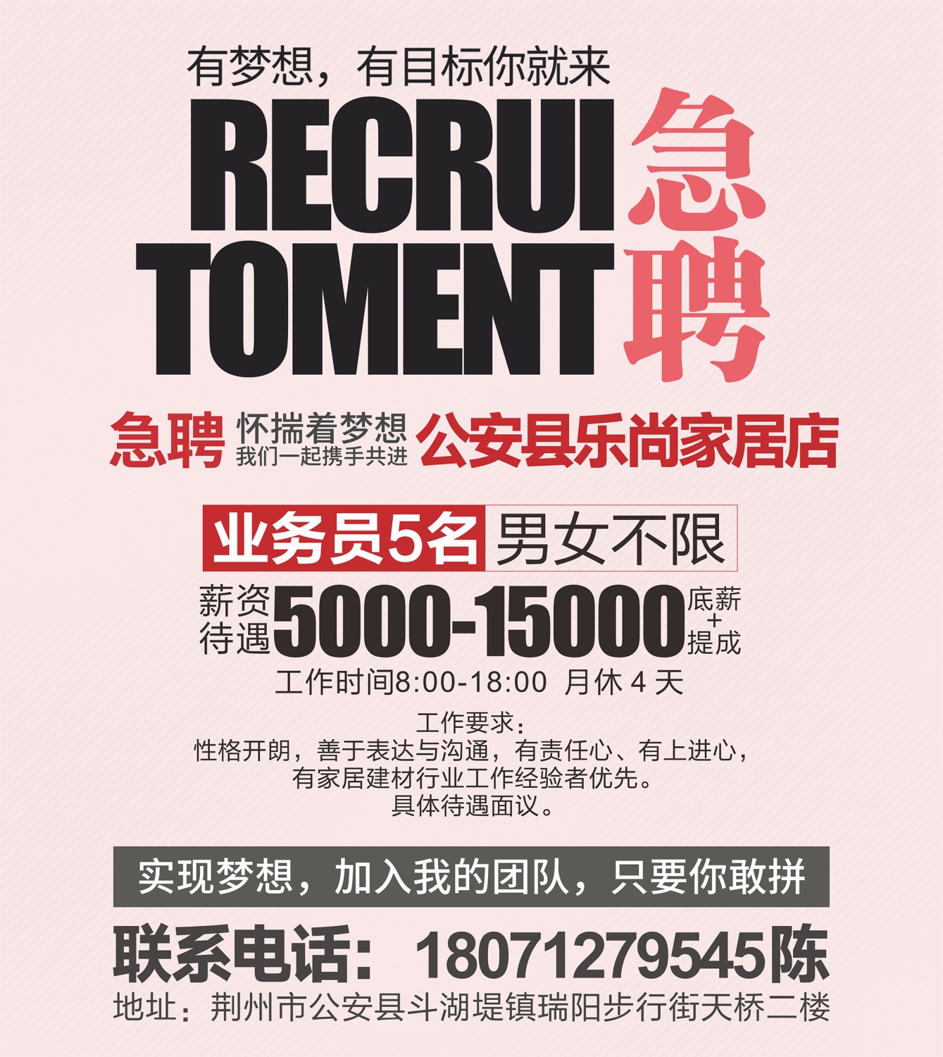 【乐尚家居急招】业务员5名,待遇5000~10000元(底薪➕提成)。男女不限,性格开朗,善于表达与沟通,有责任心、有上进心,有家居建材行业工作经验者优先。工作时间8:00~18:00,月休4天,具体待遇面议。联系人:*****9545陈 地址:荆州市公安县斗湖堤镇瑞阳步行街天桥二楼
