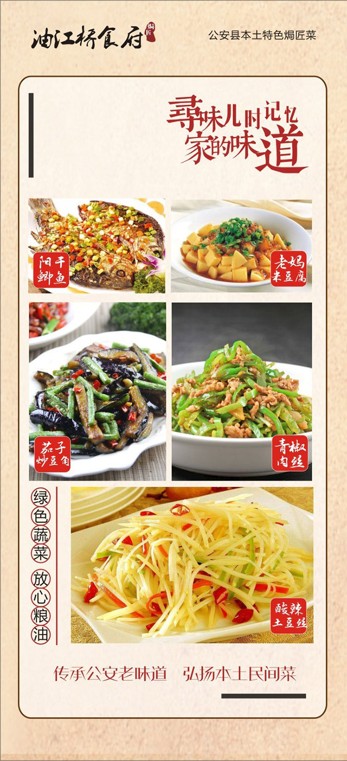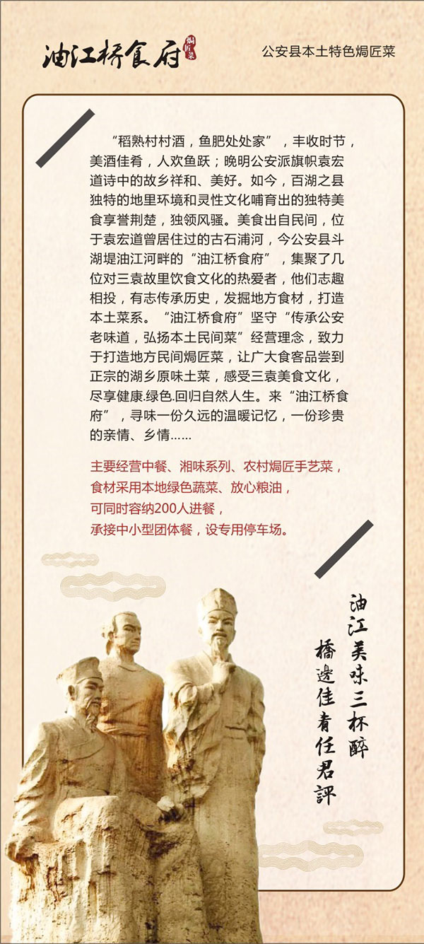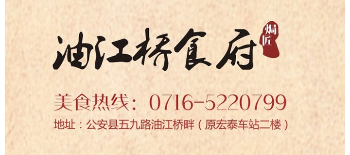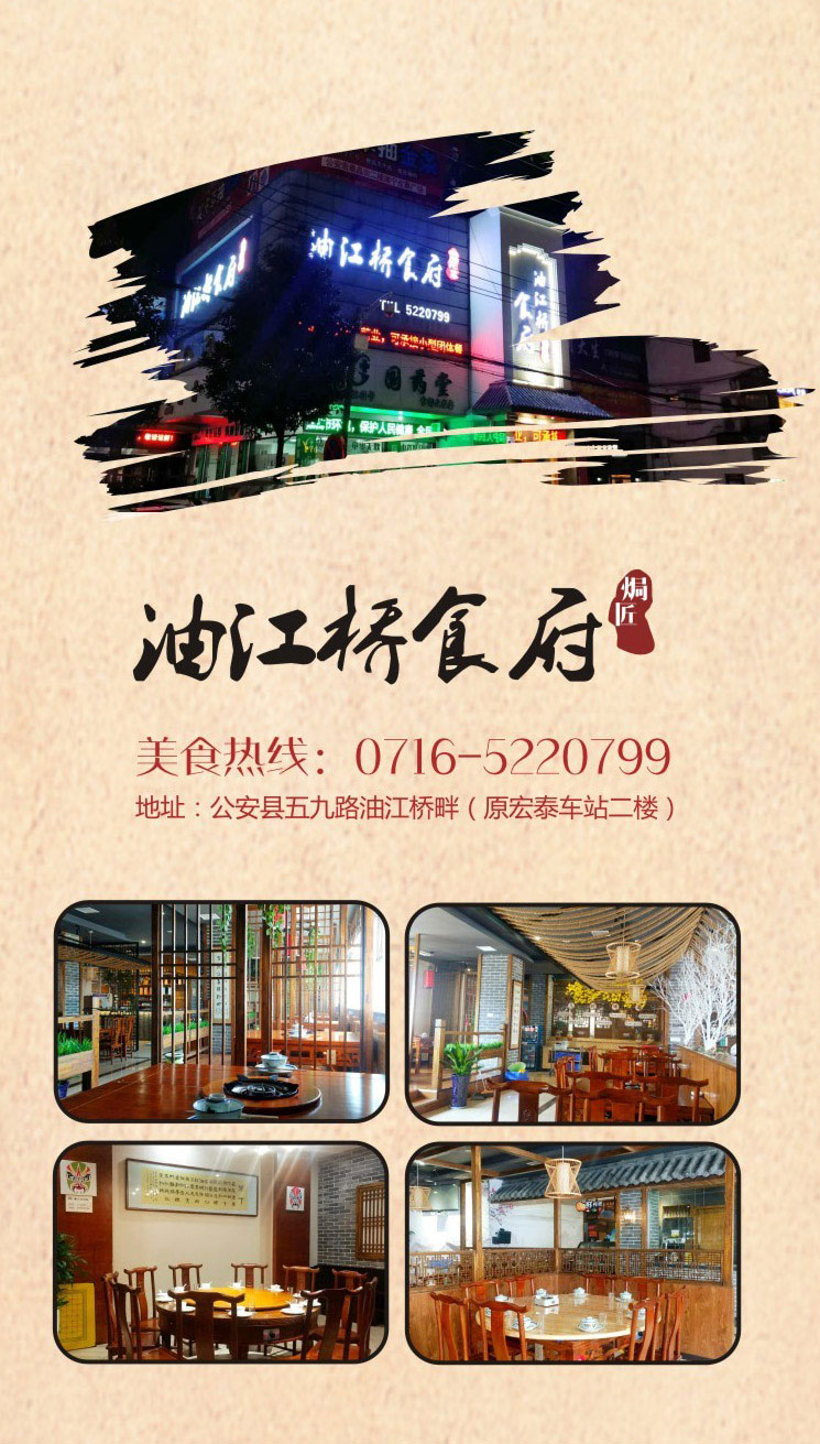 油江桥食府焗匠菜,传承公安老味道,弘扬本土民间菜,主要经营中餐、湘味系列、农村焗匠手艺菜,食材采用本地绿色蔬菜、放心粮油,可同时容纳200人进餐,承接中小型团体餐,设专用停车场。油江美味三杯醉,桥边佳肴任君评。